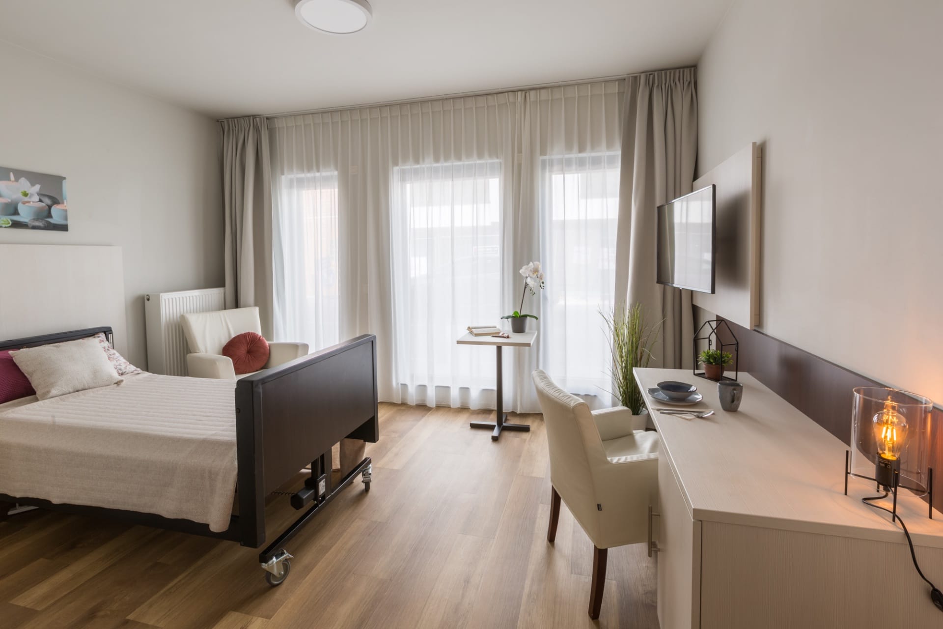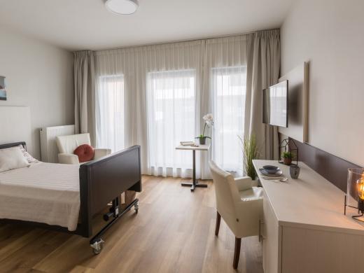 Une résidence ouverte à tous au caractère familialLa construction de la résidence Paaleyck s’est terminée en 2017. Notre maison de repos et de soins est depuis lors devenue un lieu agréable et hospitalier pour nos 70 résidents. Nous voulons avant tout être une résidence ouverte, familiale et accueillante. C’est ce à quoi s’attèle l’ensemble de notre personnel, qu’il s’agisse de l’équipe de soins, d’animation, de ménage ou de cuisine. Nous voulons littéralement être une résidence familiale car la visite des familles et amis doit aussi être agréable, notamment par un accueil sympathique à l’entrée, un intérieur chaleureux, un jardin clos et un bar et un restaurant ouverts à tous. Des chambres offrant tout le confort nécessaireToutes les chambres sont pourvues de tous les équipements utiles : une vaste salle de bains avec toilette, lavabo et douche à l’italienne, un réfrigérateur gratuit, un grand téléviseur, une connexion internet et téléphone. Certaines chambres possèdent même un balcon ou une terrasse privée. L’intérieur des chambres est chaleureux et moderne. Les fenêtres allant jusqu’au sol, la lumière inonde l’intérieur en suffisance. Les résidents en fauteuil roulant ou alités peuvent donc profiter de la vue. Le sol à l’aspect bois contribue lui aussi à l’ambiance chaleureuse. Des rappels explicites de l’environnement de soins ont été évités autant que possible. Un lieu de vie et de soinsModerne et épuré, le nouveau bâtiment assure un cadre de vie extrêmement agréable. Mais on accorde aussi beaucoup d’attention au panel de soins. L’équipe médicale et paramédicale place toujours les résidents au centre de leurs préoccupations et travaille avec un programme de soins sur mesure, y compris pour les résidents atteints d’Alzheimer, de démence ou de Parkinson. Par ailleurs, chaque chambre est équipée d’un écran tactile permettant au personnel qualifié de consulter le dossier du résident et à la famille et aux aides-soignants d’échanger des informations. De délicieux repasLes repas occupent une place importante dans la vie de tout sénior. C’est pourquoi nous leur accordons une grande importance. Tous les repas sont fraîchement préparés dans notre cuisine professionnelle. Nous tenons bien sûr compte des éventuels régimes alimentaires, mais soignons aussi la présentation des plats : pas de plateau insipide, mais bien une belle assiette servie dans le cadre agréable du restaurant. Pour le petit-déjeuner et le repas du soir, nous allons aussi volontiers plus loin. Nos résidents font en effet leur choix parmi un buffet varié qui est présenté en chambre par notre équipe tous les matins.